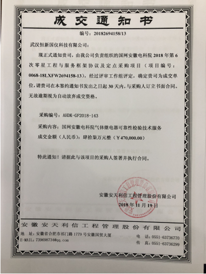 在國網安徽電科院2018年第6次零星工程與服務框架協議及定點采購中,我公司自主研發的“氣體繼電器校驗裝置”再次受到國內最高權威機構的肯定,在“氣體繼電器可靠性檢驗技術服務”項目中一舉中標。